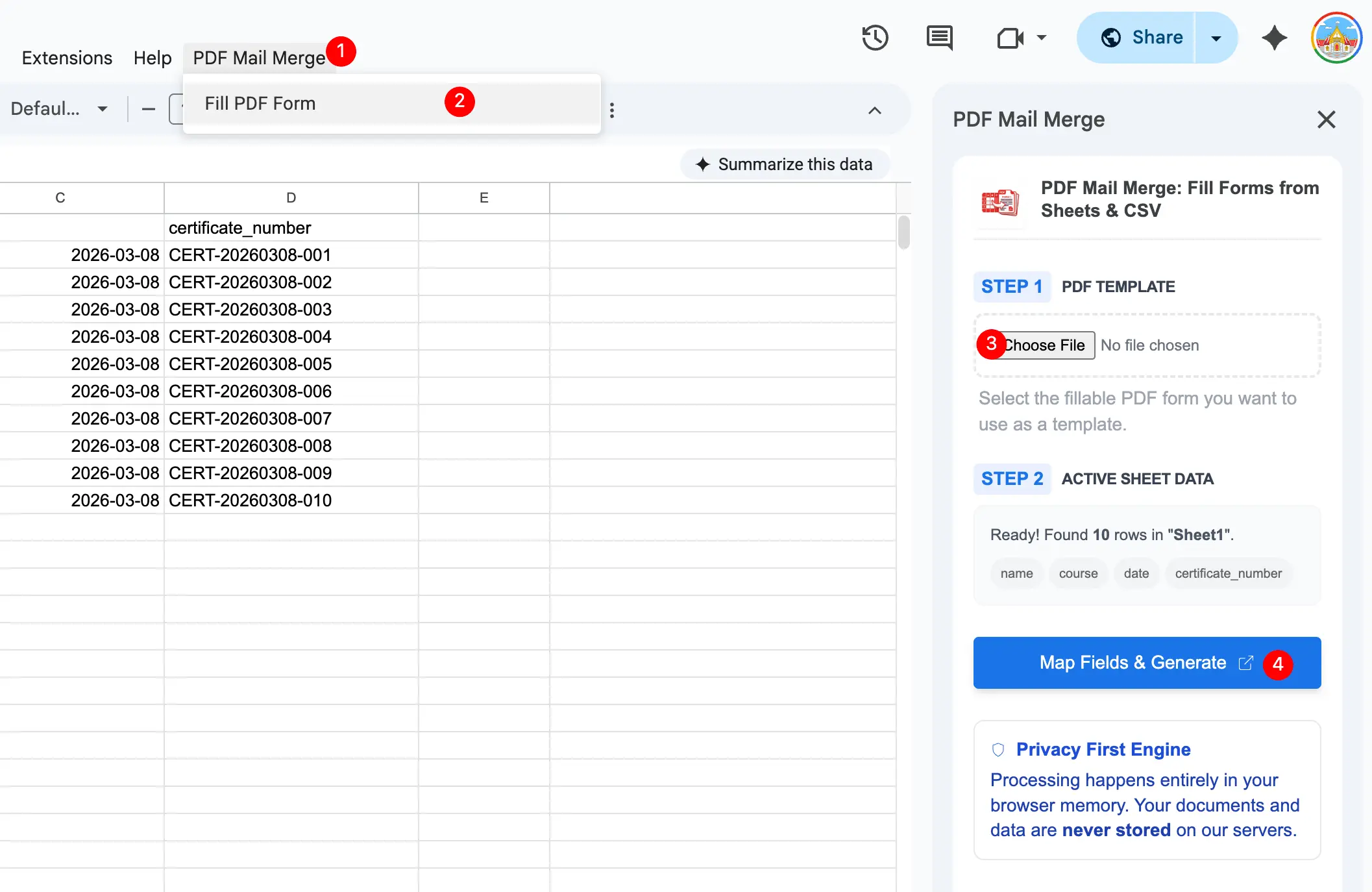 PDF Mail Merge is a powerful, privacy-first tool designed to automate your document workflow. Easily batch-fill PDF forms, certificates, and invoices directly from your Google Sheets data using our high-performance Visual Mapper.