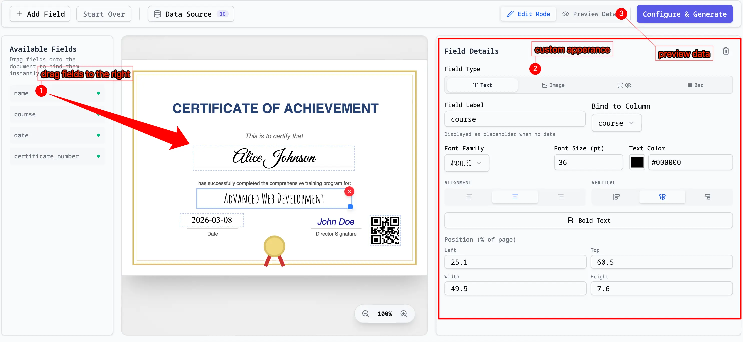 - Generate: Once satisfied, click "Generate" to create your PDFs. You can download them as a single combined file or a ZIP of individual documents.